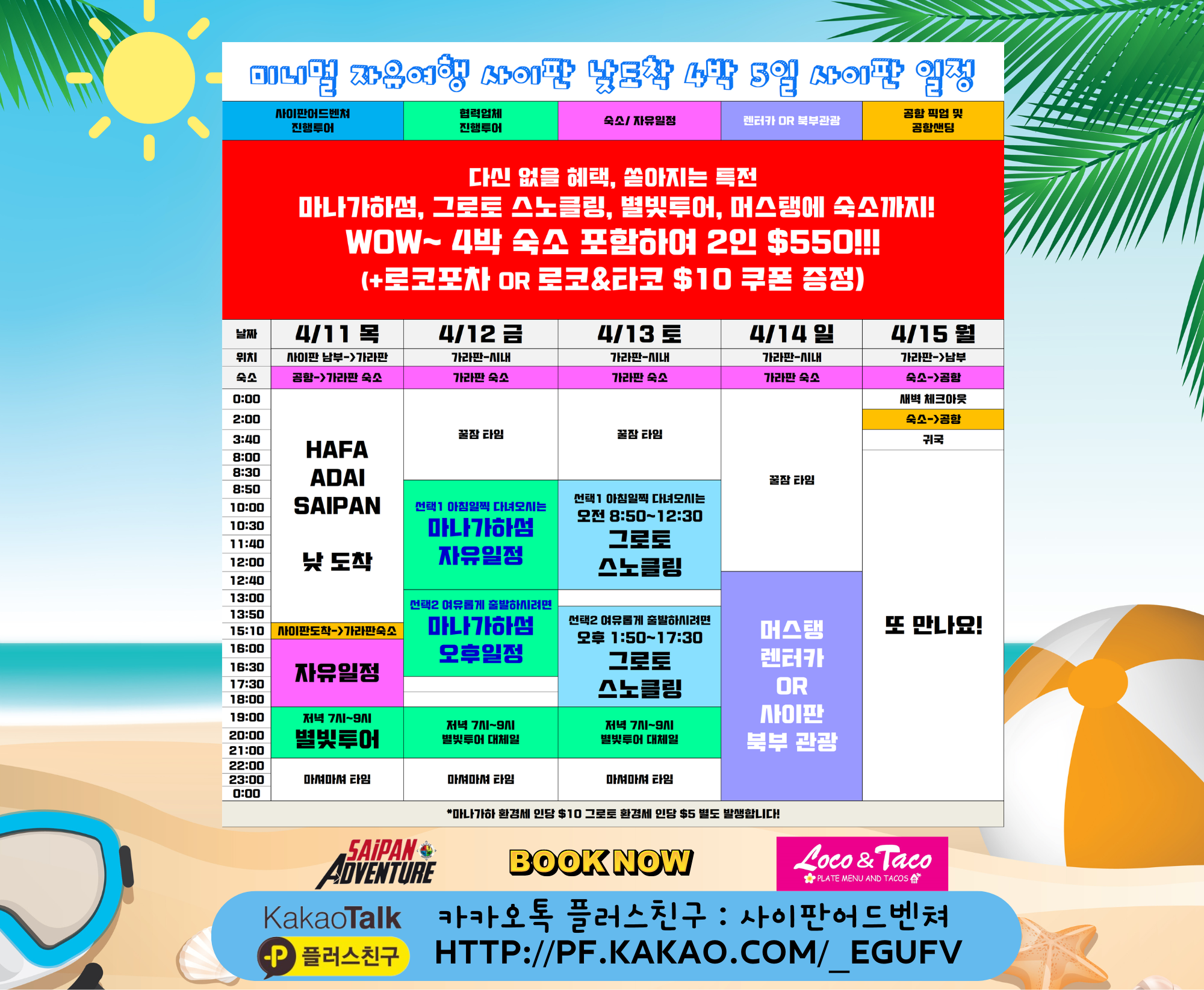 사이판어드벤쳐 자유여행 4박 5일 자유여행 미니멀 패키지는